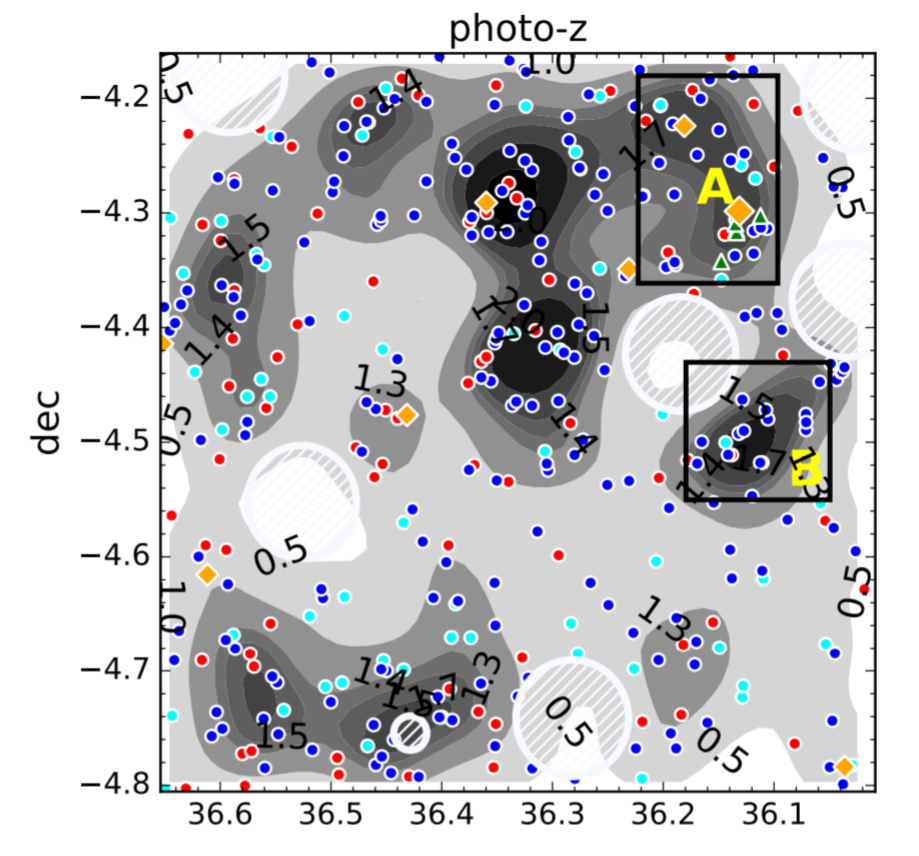 原星系团(protocluster)通常指在高红移处(z>2)还没有维里化的星系团的前身。研究这些原星系团对于我们理解宇宙大尺度结构的形成有重要帮助。此外,我们知道星系的形成受到周围环境的影响,在高密度的成熟星系团中年老的椭圆星系所占比重最大,这些椭圆星系很早就停止了恒星...