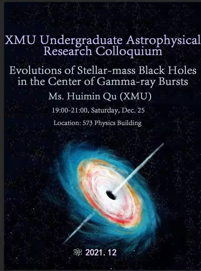 2021年12月25日,厦门大学天文学科拔尖计划班召开了十二月例行本科生学术研讨活动。本次活动邀请了18级本科生瞿惠敏同学介绍她在伽马射线暴和黑洞质量增长方面的研究工作,分享本科生做科研项目的经历。图1:本次活动宣传海报活动中,瞿惠敏同学从伽马射线暴的背景知识讲到他...