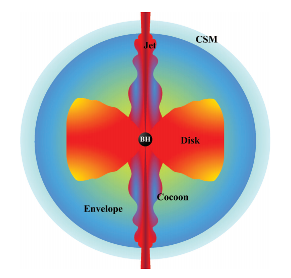 坍缩星模型是解释伽玛暴的标准模型之一。大质量恒星演化末期,其核心坍缩形成超吸积黑洞。该超吸积盘有可能通过正反中微子湮灭机制或者Blandford-Znajek机制产生喷流。如果喷流可以成功突破恒星的包层以及星周介质,那么就有可能在沿着喷流方向观测到伽玛射线暴。刘彤教授课题...