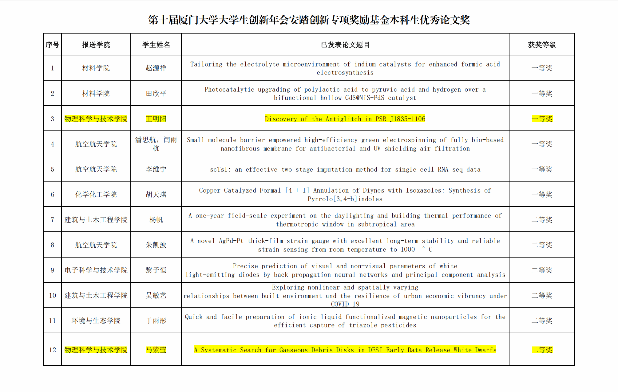 近日,第十届厦门大学大学生创新年会安踏创新专项奖励基金本科生优秀论文奖评选结果揭晓。我系本科生凭借扎实的专业素养和出色的科研成果,在激烈的竞争中脱颖而出,荣获一等奖1项、二等奖1项。其中,王明阳同学撰写的论文荣获本科生...