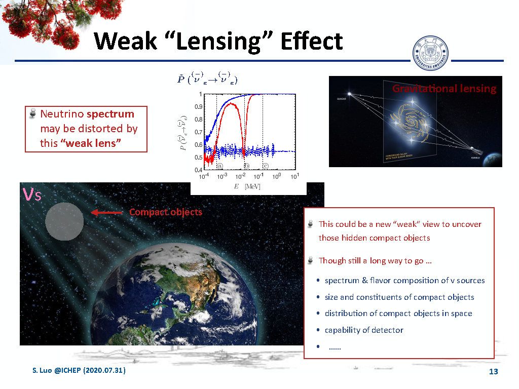 目前各类中微子探测器所关注的都是活动剧烈的天体源,例如伴随活动星系核或伽马射线暴产生的高能中微子,或者MeV能量的超新星中微子,而对于那些已经不再经历剧烈核反应的天体则极难通过直接观测它们所产生的中微子发现。而我们的研究发现,如果在MeV中微子传播的路径上存在这样“隐形”但致密的天体,由于物质效应,将显著改变MeV中微子的能谱和味分布。这种致密天体中的物质效应在穿过它的MeV中微子束流能谱上产生的信号具有独特且易辨认的特征,并且由于其产生的机制简单直接,我们有可能从能谱的变化上获知该天体的大小和密度的信息。这一效应有些类似引力透镜,我们管它叫做“中微子透镜”,它通过中微子能谱的“扭曲”来发现宇宙中的物质分布。