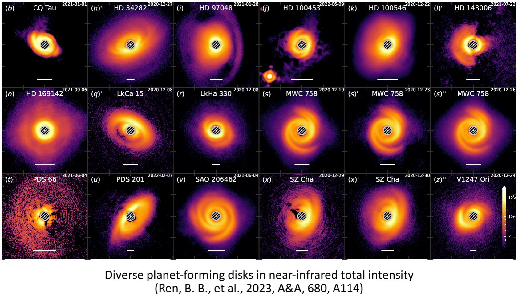 高对比度成像例三:行星形成系统,行星形成于围绕着恒星运动的星周盘中。图片来自《Astronomy & Astrophysics》第680期封面图片“Diverse planet-forming disks in near-infrared total intensity”对我们此工作的报告。