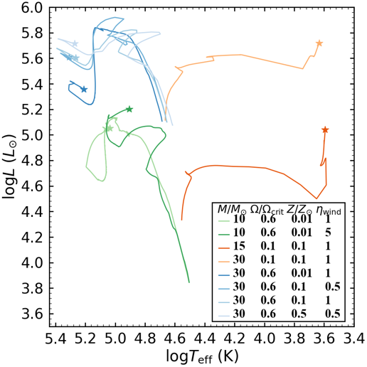 图1 不同初始质量、旋转速率、金属丰度和星风质量损失系数的大质量恒星的赫罗图。