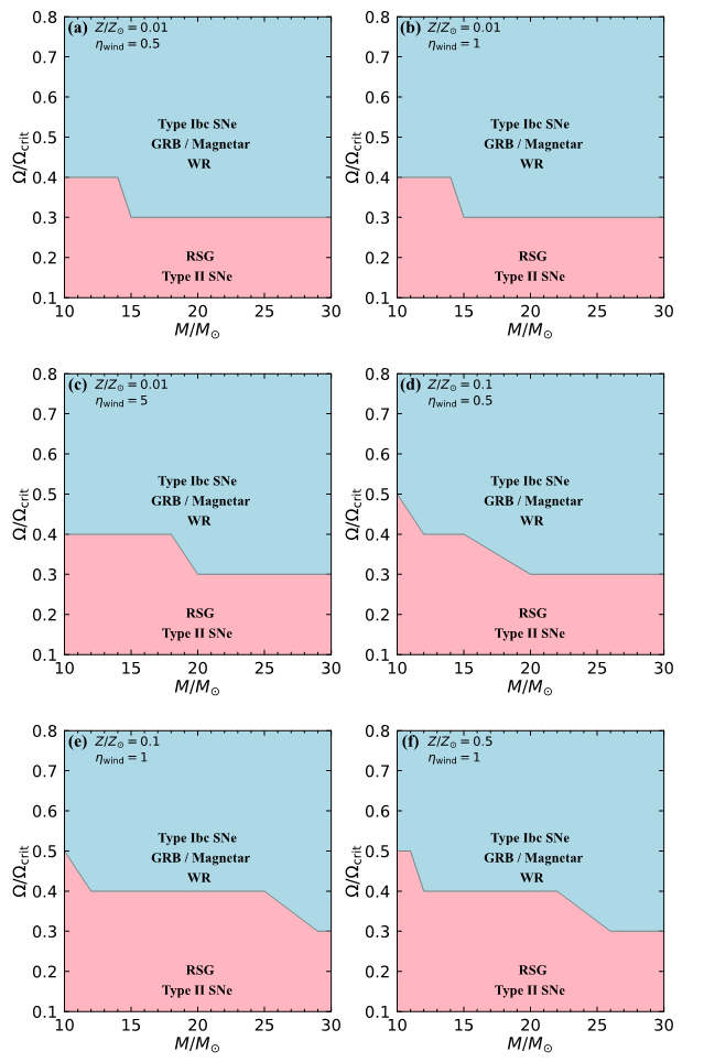 图2 从具有不同初始金属丰度和星风质量损失系数的恒星模型中产生磁陀星所需的初始质量和旋转速率的范围图。具有蓝色区域内对应的初始参数的模型才能演化成WR星,而这些WR星最终可能在核心坍缩时发生超新星爆炸或长暴暴,从而产生磁陀星。