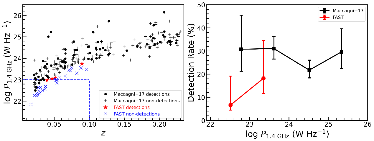 图    1   :左:FAST观测样本和Maccagni et al. (2017) 研究样本在红移和射电功率空间的对比,可以看出在固定红移处我们探测到的源的连续谱辐射都是最弱的。右:FAST 观测样本与 Maccagni et al. (2017) 的样本的HI吸收线探测率对比。