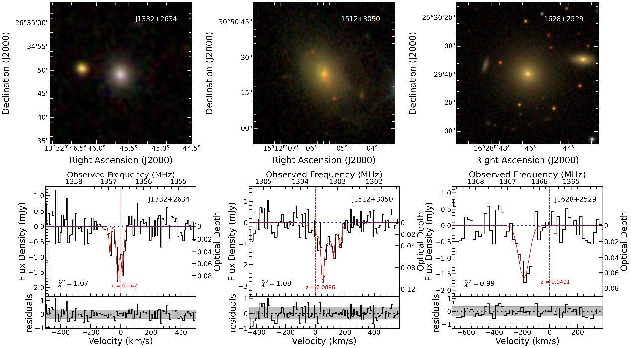 图   2   :三个源的 SDSS 光学图像及其对应的 HI 光谱。每一个光谱图中的红色曲线代表高斯拟合轮廓,虚线标出了源的光学红移。谱线速度相对系统速度有较大红移/蓝移,则可能对应气体内流/外流。