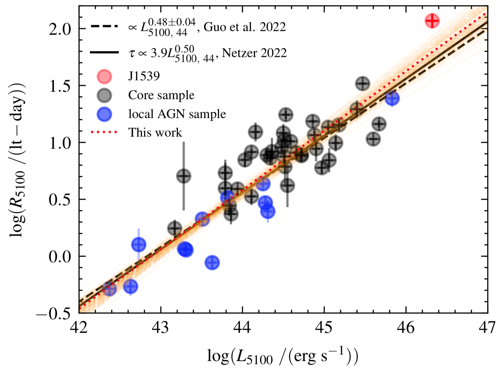 我们还将SDSS J153913.47+395423.4的时间延迟测量结果与X射线强类星体的研究结果进行了比较,发现SDSS J153913.47+395423.4位于连续谱时间延迟-光度关系的上方。考虑到SDSS J153913.47+395423.4也是弱发射线类星体,其宽线区的弥散连续谱辐射也应该较弱。因此,我们的结果表明连续谱时间延迟-光度关系或与宽线区云团无关。未来,我们将继续对更多X射线弱类星体展开连续谱反响映射研究,系统性地检验前述模型,从而更准确地理解连续谱时间延迟与类星体中心引擎物理尺度的内在联系。