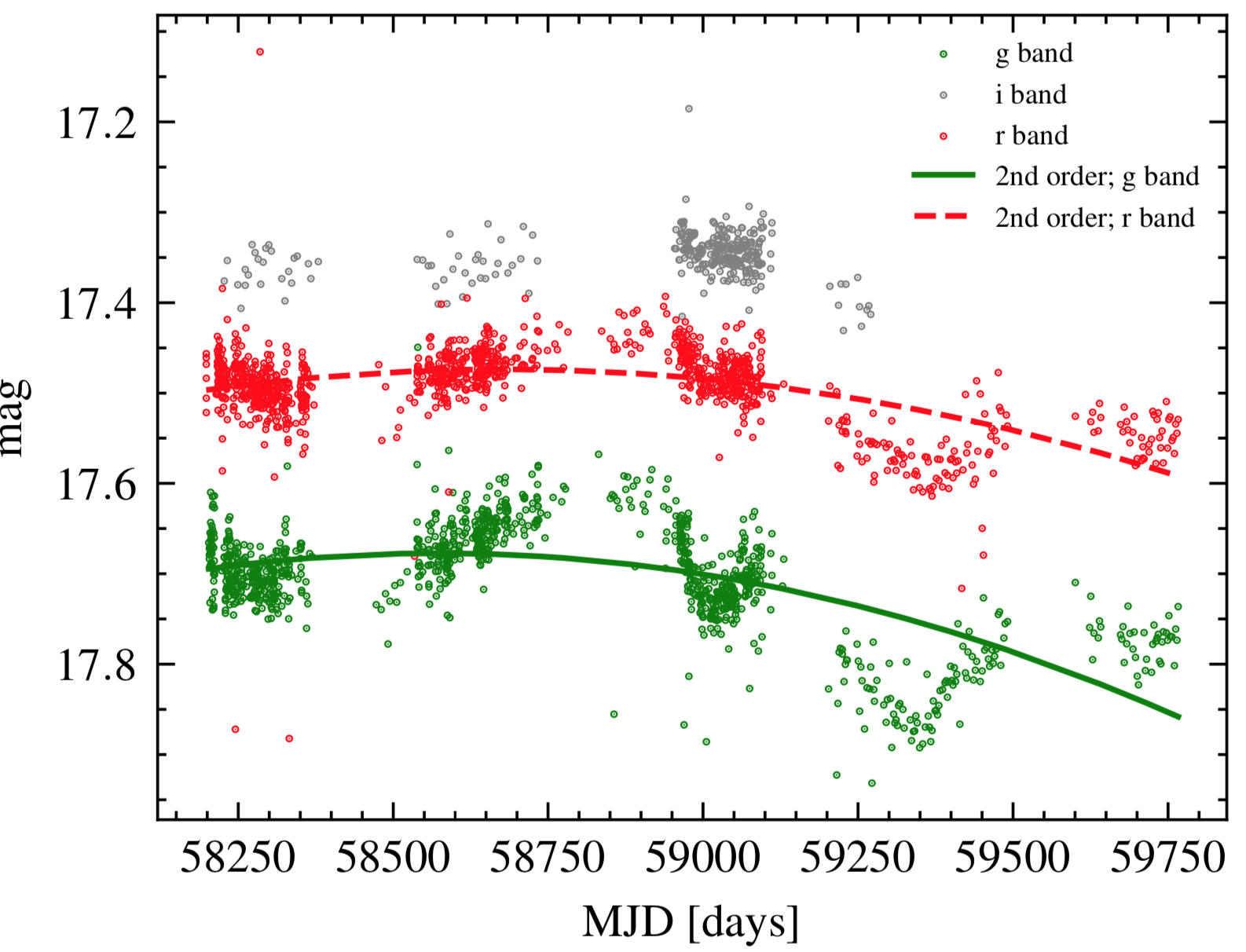 SDSS J153913.47+395423.4的光变曲线,可以看出g和r存在显著的相关性(来自原文图2)