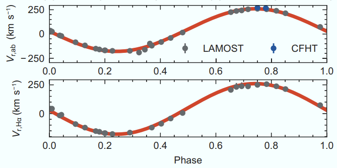 图3:利用LAMOST和CFHT光谱,获得可见恒星的多普勒频移,表明可见恒星围绕不可见天体快速绕转,视向速度达到约 250 千米每秒。图片取自论文图6。