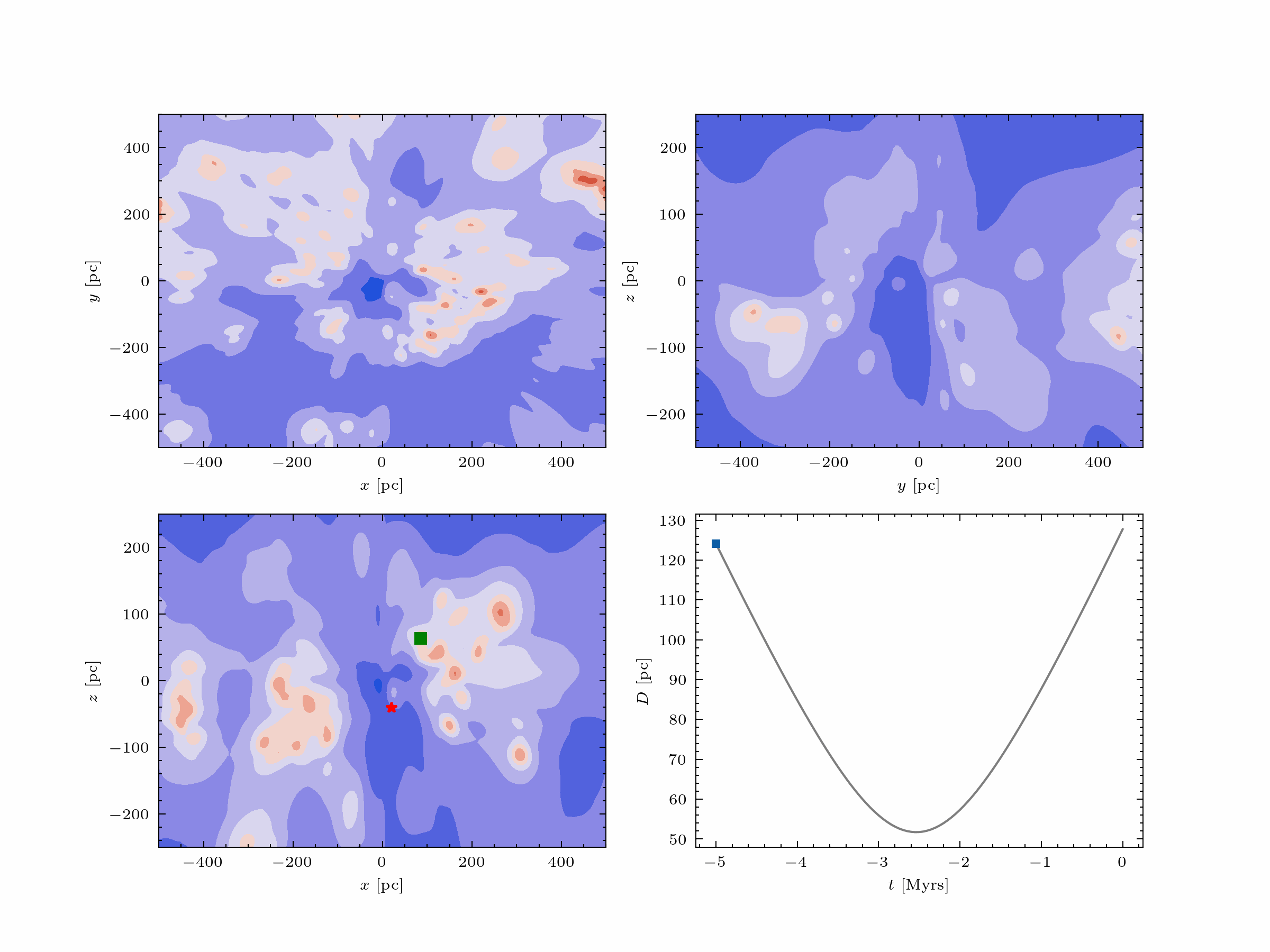 图4:太阳系周围星际介质密度分布,越蓝表示密度越低,越红表示密度越高。绿色方块代表J2354过去500万年的运动轨迹;红色五角星代表太阳系的运动轨迹。左上、右上、左下的子图分别代表x-y、y-z、x-z的二维切面图。右下子图代表J2354与太阳系的历史距离随时间的变化情况。可以看出,该中子星候选体与太阳系的历史距离最近仅为160光年。图片取自论文图13。