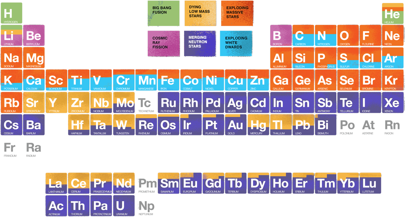 图1:天文学家的元素周期表。不同颜色代表不同物理起源:宇宙大爆炸(绿色)、低质量恒星死亡(橙色)、大质量恒星爆炸(红色)、宇宙线裂变(粉色)、中子星并合(紫色)和白矮星爆炸(蓝色)。图片来自NASA/CXC/K. Divona; SDSS blog, J. Johnson