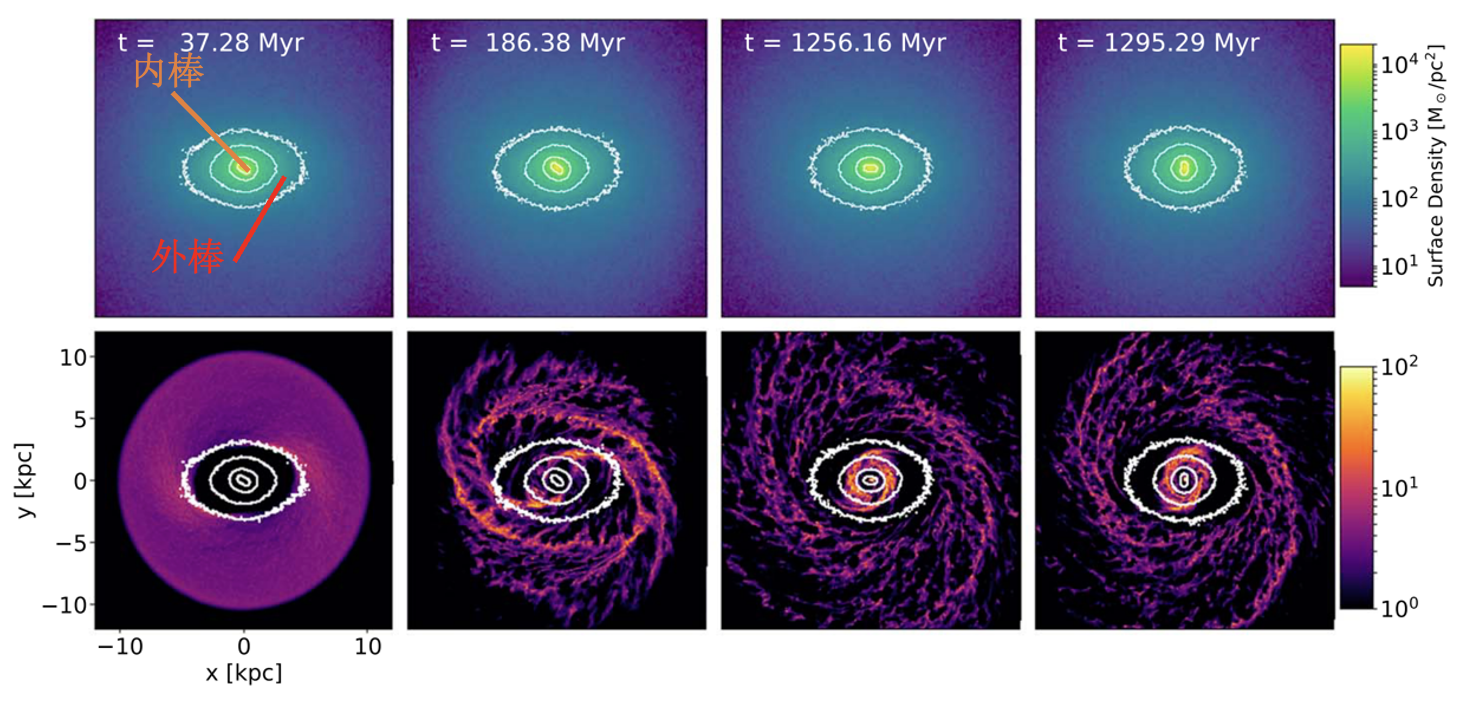 图1. 双棒星系中,模拟两个棒不同夹角情况下,气体由星系外区向中心超大质量黑洞的流动过程。上图为双棒星系的恒星面密度分布,下图为对应时刻气体的面密度分布。