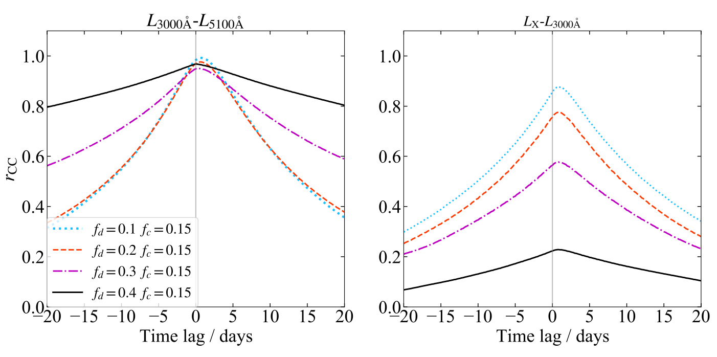 图4:左:不同吸积盘平均温度波动下紫外与光学波段光变曲线之间的相关性。右:不同吸积盘平均温度波动下X射线与紫外/光学波段光变曲线之间的相关性。图取自Ren et al. 2024。