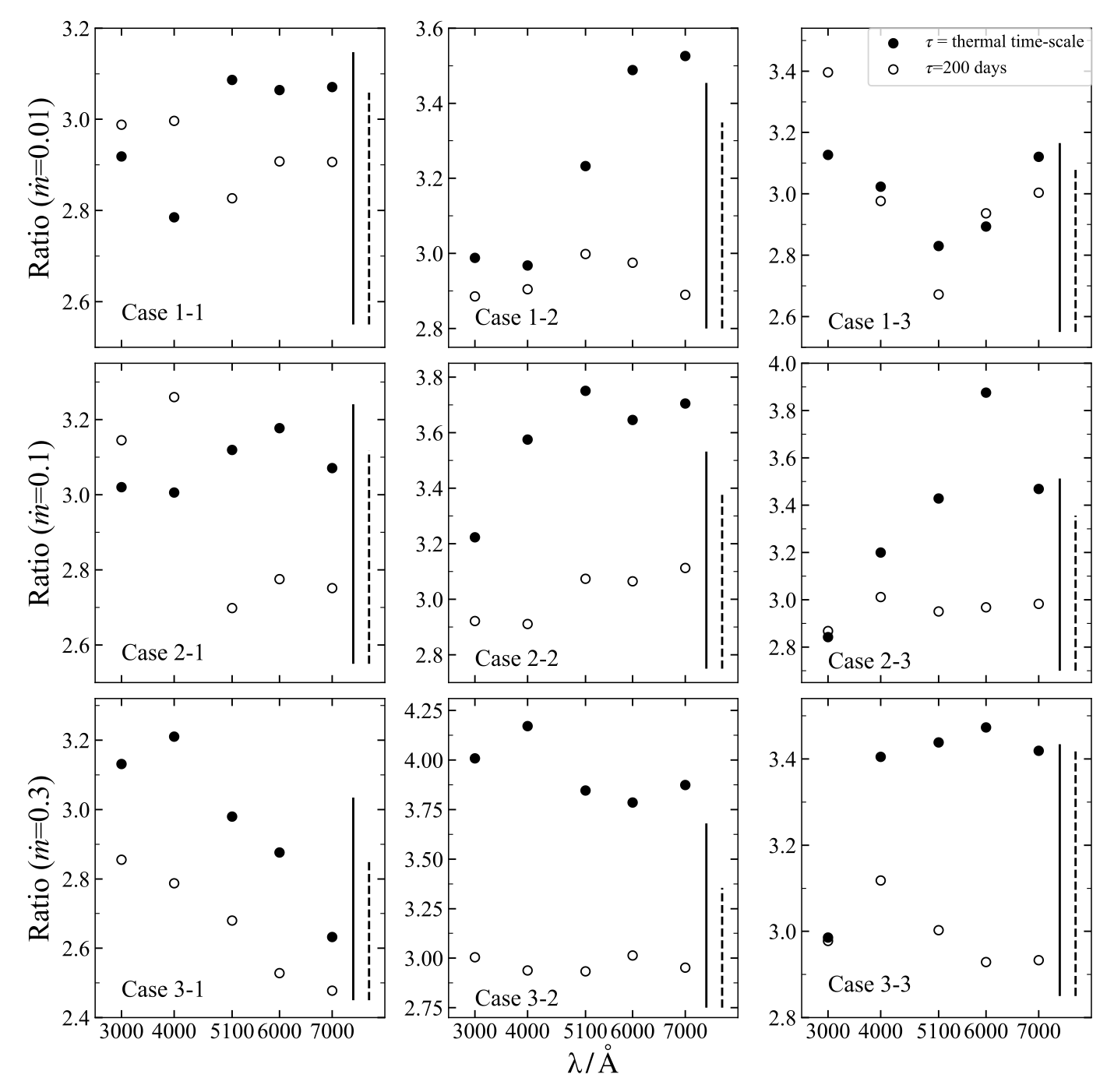 图2: 吸积盘尺寸放大倍数与波长的关系。实心点表示阻尼阻尼时标是半径函数的情形,空心点表示阻尼时标固定为200天的情形。实线和虚线分别是实心点和空心点的误差。图取自Ren et al. 2024。