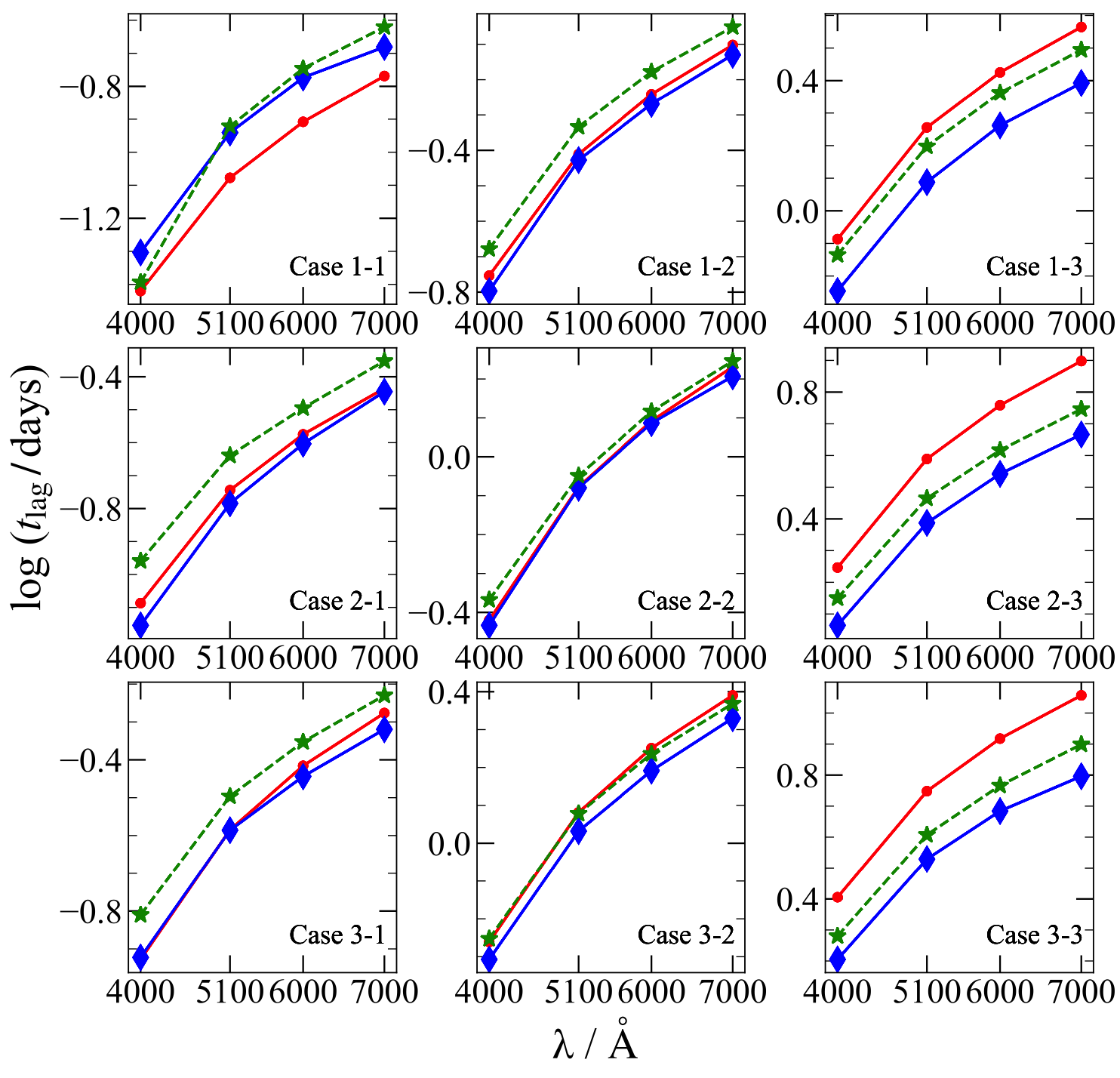 图3: 不同波段之间的时间延迟。红色数据点表示SSD模型预测的时间延迟,蓝色数据点和绿色数据点分别表示吸积盘的平均温度波动为0.3和0.15时,非均匀吸积盘的X射线再辐射模型预测的时间延迟。图取自Ren et al. 2024。