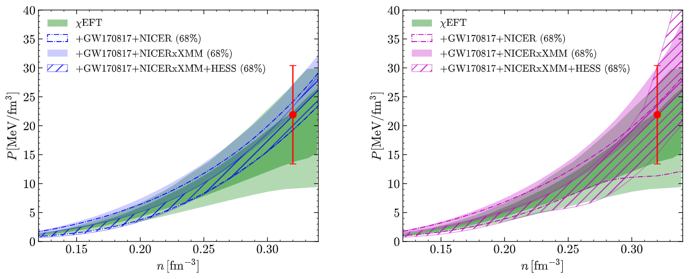 左图:中子星(Neutron stars)的重子数密度与压强关系(EOS)的后验分布;右图:相应混杂星(Hybrid stars, i.e., Neutron stars with a quark core)的后验分布。两个图中还显示了使用N3LO χEFT计算得到的68%和95%的置信区间;带有误差棒的数据点对应未包括XMM-Newton数据的J0030+0451半径测量时推断的压强范围。可以看出,当前使用多个x射线数据的分析给出了在2倍原子核密度附近EOS更窄的限制范围。