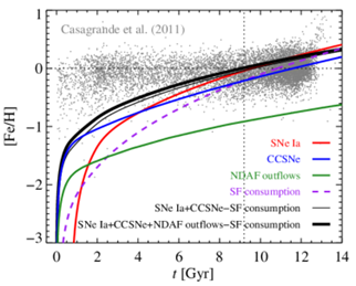 图1. 太阳近邻[Fe/H]随时间的化学演化