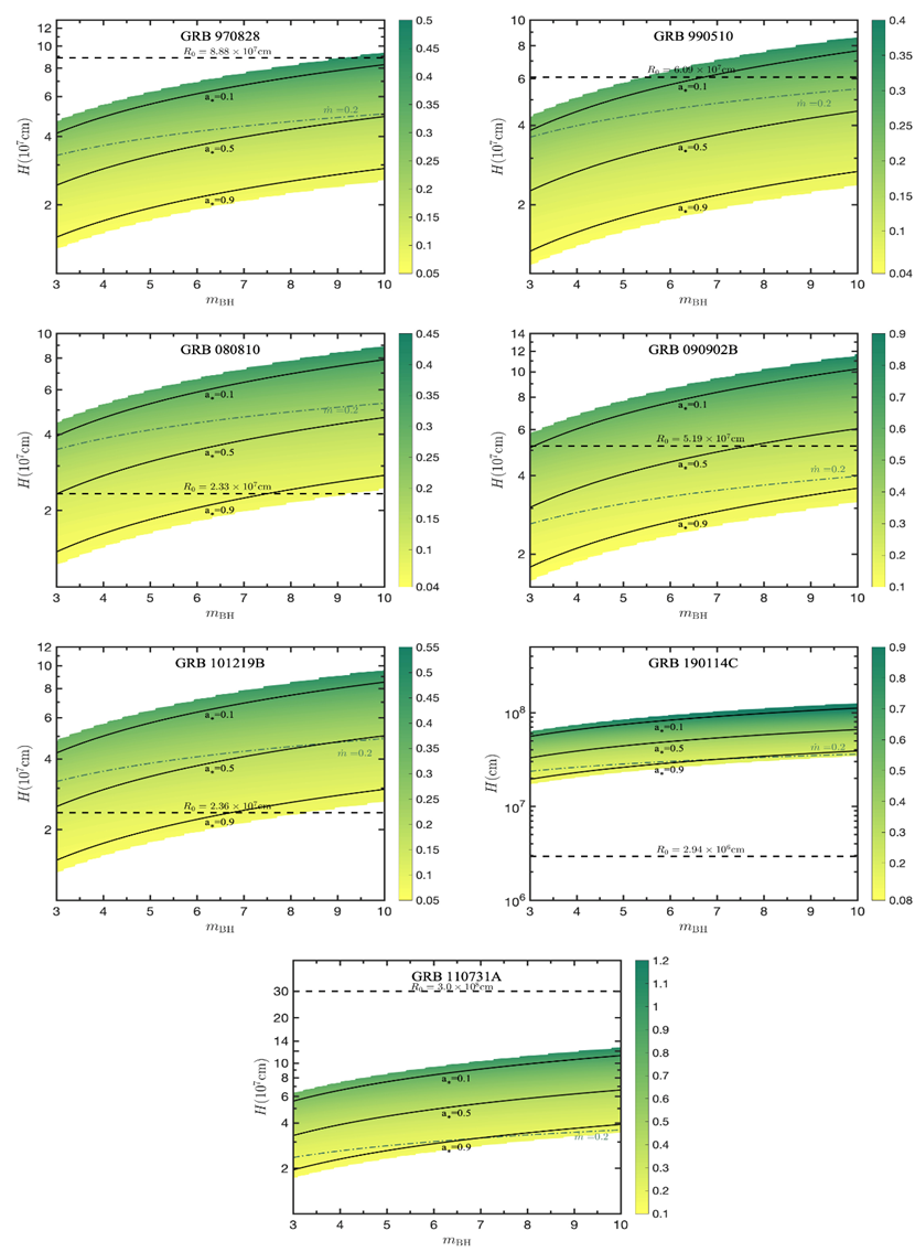 图1、对于具有显著热成分的伽马暴样本,在黑洞中微子主导吸积流模型下,中微子湮灭高度范围与火球初始半径的对比