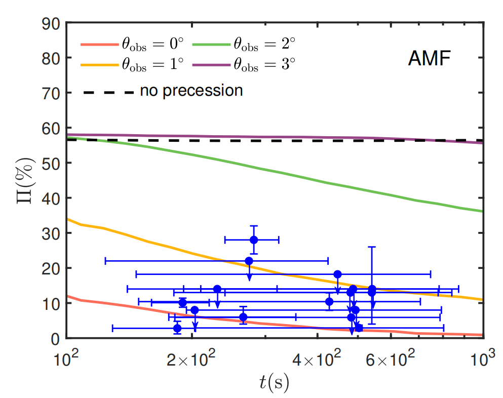 考虑到喷流进动在空间上的对称性可能会导致来自喷流大尺度有序磁场的高偏振在一定程度上被消减,我们探究了喷流进动对早期光学余辉的消偏振效果。如图1所示,喷流绕着P轴旋转,而视线方向与Z轴重合。在此图像下,研究发现喷流进动消偏振的效果主要依赖于观测角度。如图2所示,当观测角足够小时,消偏振的效果十分明显。此外,目前观测到的早期光学余辉偏振(蓝色圆点)倾向于一个1。左右的观测角。该工作结果表明,喷流进动是早期光学余辉低偏振度的一种潜在机制。