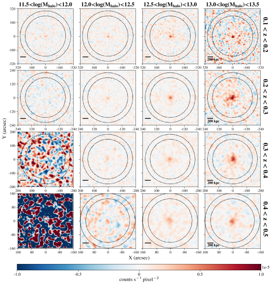 图2:在0.2-2.3 keV能量范围内,扣除了背景的X射线表面亮度叠加图像。环状区域表示用于计算背景的区域。在大多数子样本中都可以看到辐射,但在大质量端,辐射更为延展且更明亮。每个面板中的比例尺对应于 200 kpc。