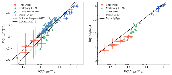 图3:本研究中的光度和重子质量结果(红色)与过去的研究结果的比较。包括了来自其他研究的贫星系群(绿色)和大质量的星系群和星系团(蓝色)。左图中,实线表示来自于Lovisari et al. (2015)基于星系群样本得到的光度-质量关系,虚线则表示来自于Schellenberger et al. (2017)基于星系团样本得到的光度-质量关系。右图中,实线展示了基于标准宇宙学的重子质量预测值。