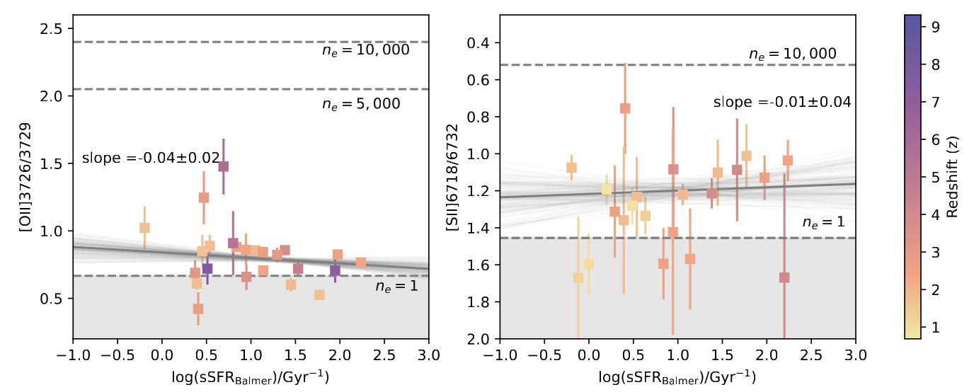 图一:[OII]流量比和比恒星形成率(sSFR)的关系,[SII]流量比和sSFR的关系,两者呈现微弱的负相关。