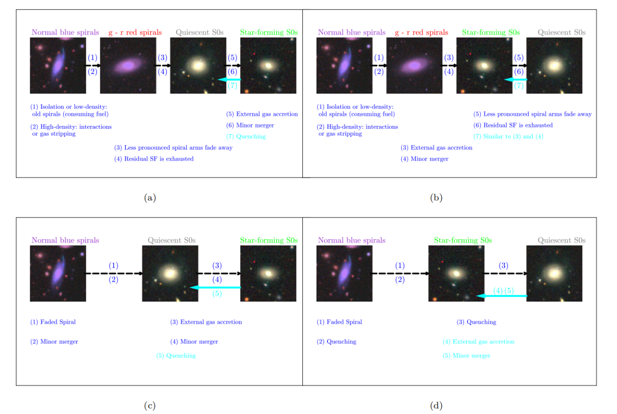 图3:SFS0s可能的演化场景。图中不同类型星系图来自DESI g/r/z波段伪彩色图,并且不同类型星系之间可能经历的过程用不同颜色数字表示。