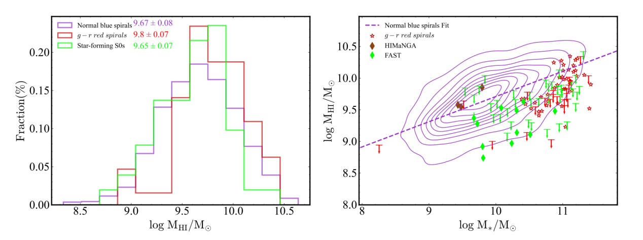图2:研究样本中MHI直方图以及MHI - M*的关系。图中紫色等高线表示正常蓝色漩涡星系的数密度分布,向下的箭头表示对应上限。不同颜色实心菱形表示对应HI的信噪比大于5的源。