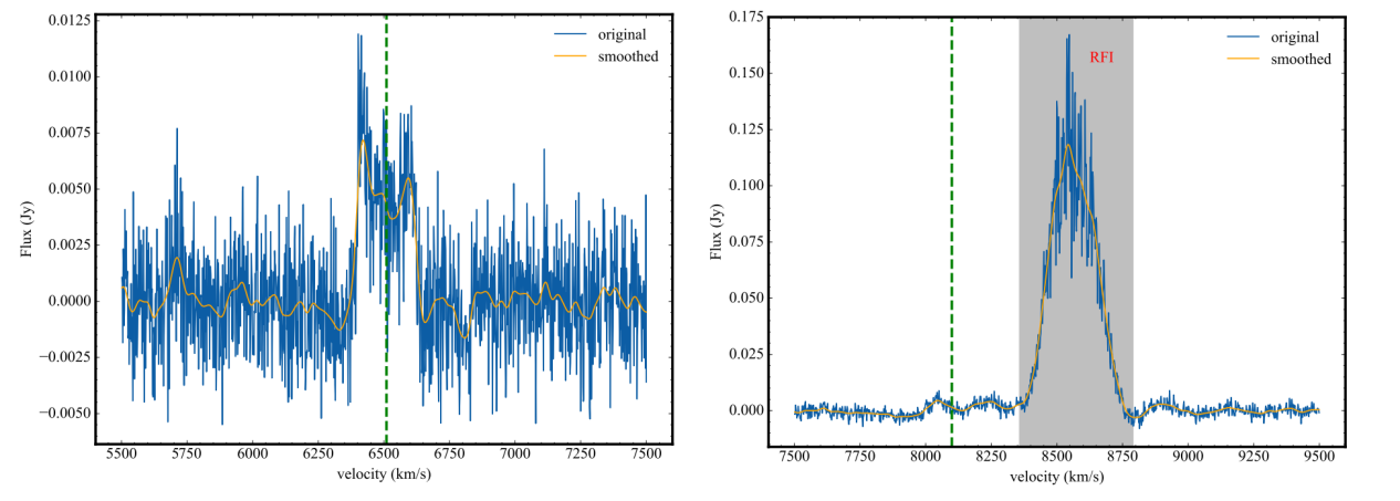 图1:SFS0s中HI发射的两个例子。图中蓝色与橙色的线分别表示原始数据以及速度分辨率平滑到10 km/s的数据,绿色虚线表示由星系红移转换的中心速度。射频干扰显示为图中灰色阴影区域。