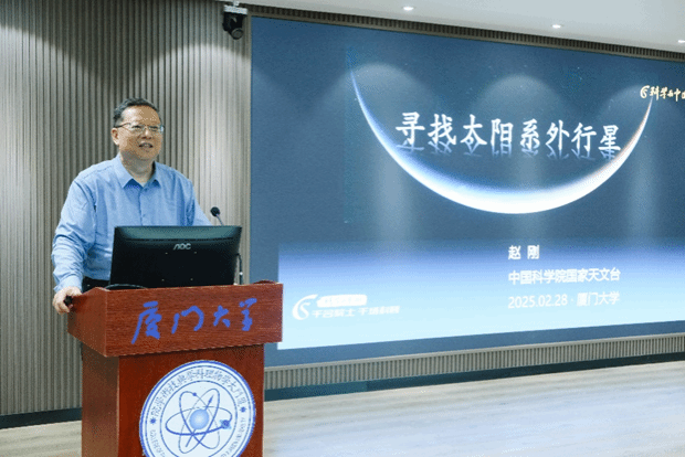 2025年2月28日下午,中国科学院院士、中国科学院国家天文台首席科学家赵刚研究员,应邀在厦门大学海韵校区物理大楼552报告厅为厦门大学天文学系师生分享了题为“寻找太阳系外行星”的南强学术讲座。讲座开始前,方陶陶教授向赵刚院士赠送“厦门大学南强学术讲座”纪念牌。