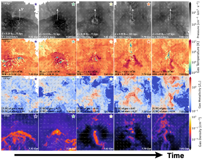 图3: 流体动力学模拟下的一个类M32富金属致密矮星系关键形成期的化学动力学演化。我们认为,正是高冲压压力限制了富金属气体外流。这些气体随后重新参与到下一代恒星的形成过程中,使得这些恒星能够迅速达到较高的金属丰度。