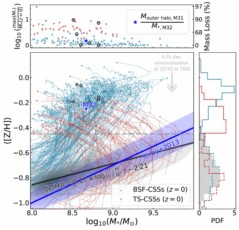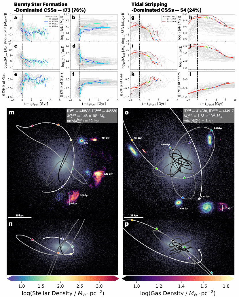 TNG50模拟中近80%的致密矮星系是在高压下通过强烈的星暴形成的,这有效地保留了富金属气体并导致了星系快速的金属增丰(图3)。传统的潮汐剥离理论则很难解释观测到的致密矮星系的富金属特性和较多的星系数目。特别地,该研究成功地理解了仙女座星系中存在的致密矮星系M32的形成过程,解释了传统的潮汐剥离理论无法解释的仙女座星系周围缺乏潮汐碎片的问题。