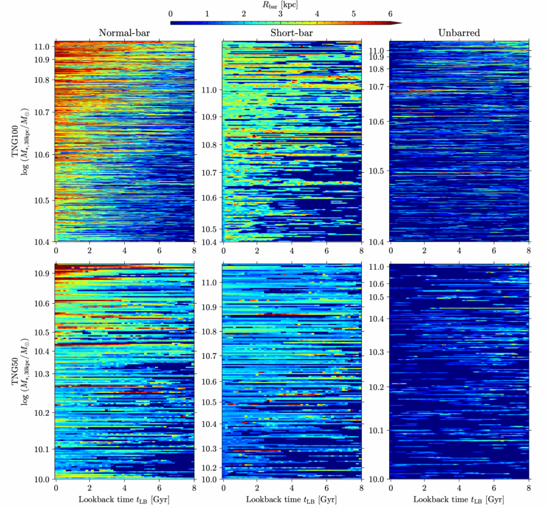 图 1:TNG 模拟中盘星系的棒长随时间的演化。颜色表示棒长,每张子图中的每一行对应一个星系。左、中、右三列分别表示在红移 z=0 时为正常棒、短棒和无棒的星系。