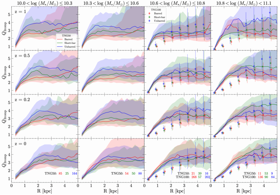 本研究基于大规模星系宇宙学模拟IllustrisTNG中TNG100和TNG50两套模拟数据,追踪了2300余个盘星系从红移z=1(约80亿年前)至z=0(现今)的演化,通过统计检验(K-S检验)对比有棒、短棒与无棒星系的特性,结合并合事件与盘稳定性分析,系统地揭示不同质量星系中棒结构形成的主控机制: