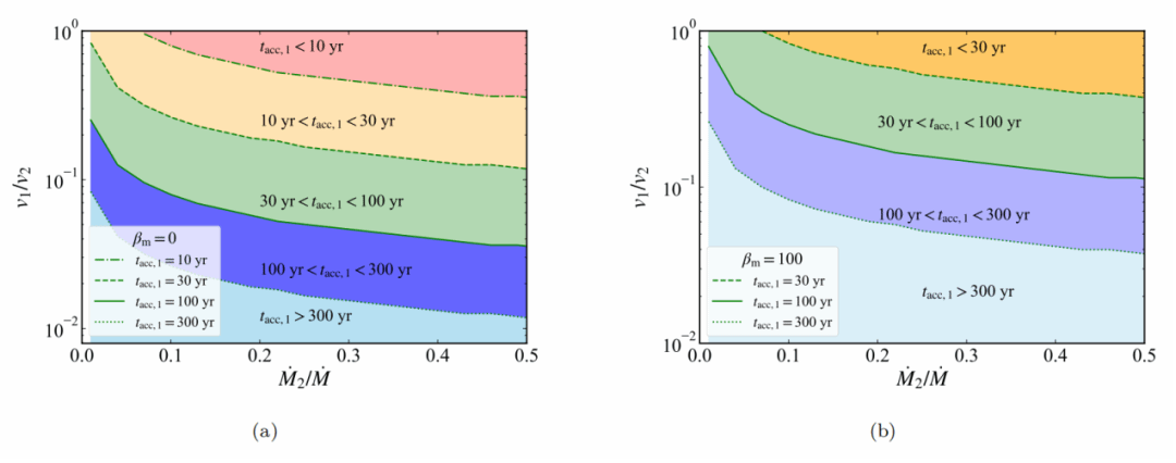 图2. 参数空间内不同时标对应的区域。(a)盘2由气体压主导的情形,对应于“热冕”;(b)盘2由磁压主导的情形,磁压取值为气体压的100倍,对应于“温冕”。