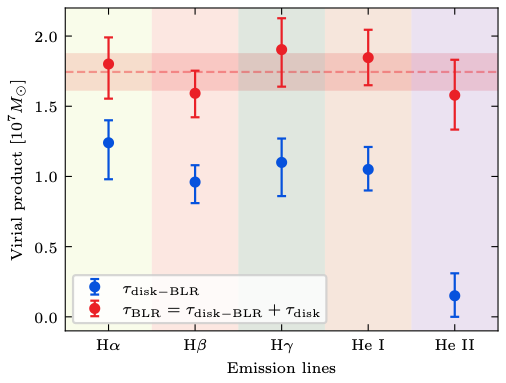 图3:连续谱时延对黑洞质量的修正。当不修正连续谱时延时(蓝色点),HeII发射线得到的黑洞质量远低于其他宽发射线。考虑连续谱时延的影响后(红色点),不同发射线给出基本一致的黑洞质量。图取自Zhou et al. 2025。