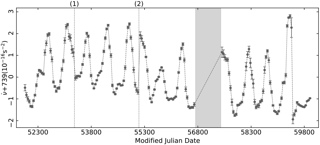 图2. PSR J0922+0638在2001-2023年间的自转演化。垂直虚线表示正常跃变的发生时期,顶部括号中的数字对应于跃变序号。