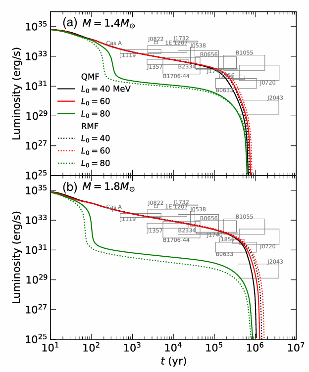 图 两个不同质量孤立中子星冷却曲线对核多体模型和对称能斜率的依赖。