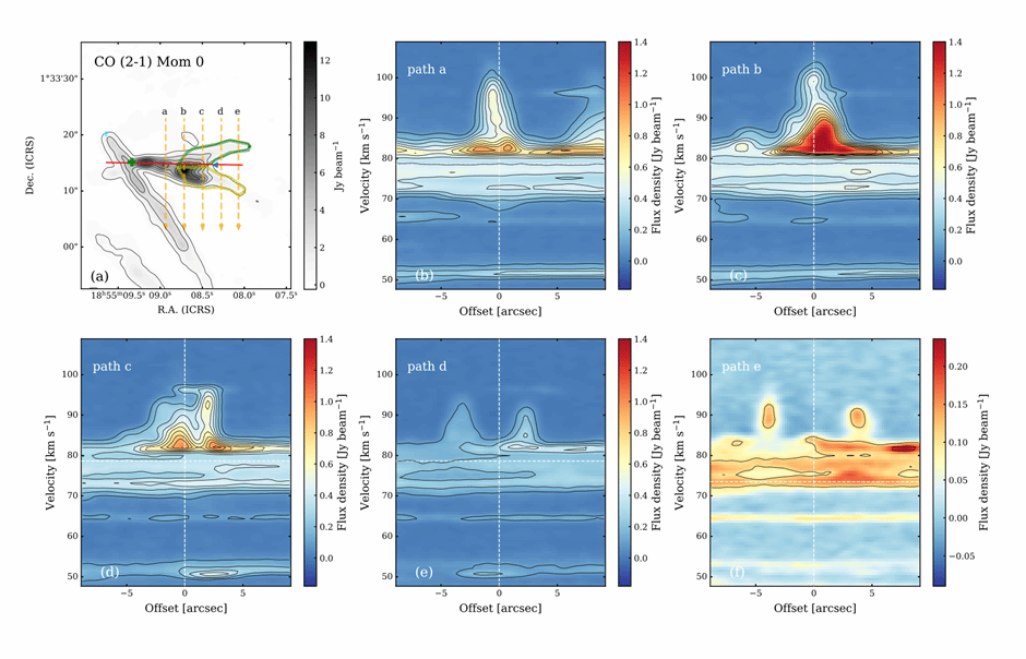 图1 (a)CO (2–1)积分强度图中分叉流结构的放大区域。蓝色三角形标记了外流分叉的位置。红色实线连接中心原恒星(绿色叉号)与分叉点(蓝色三角形)。绿色和黄色区域分别代表分叉结构的北部和南部。橙色箭头表示垂直于 I 号外流分叉结构的五条切片路径。(b–f) 展示自 (a) 面板中所示五条路径提取的CO(2-1)的位置-速度图,每条路径的切片宽度为 1″.4。垂直的白色虚线表示路径中心,水平白色虚线表示系统速度。图取自Lin et al. 2025。