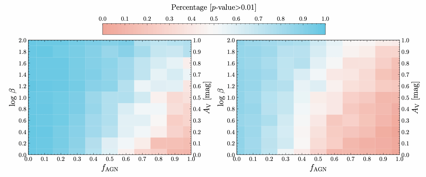 图3: 真实观测数据与磁耦合模型模拟的对比。左图为JWST/F115W,右图为JWST/F150W。颜色越红,表明越能基于观测排除模型。图源:原文图3。