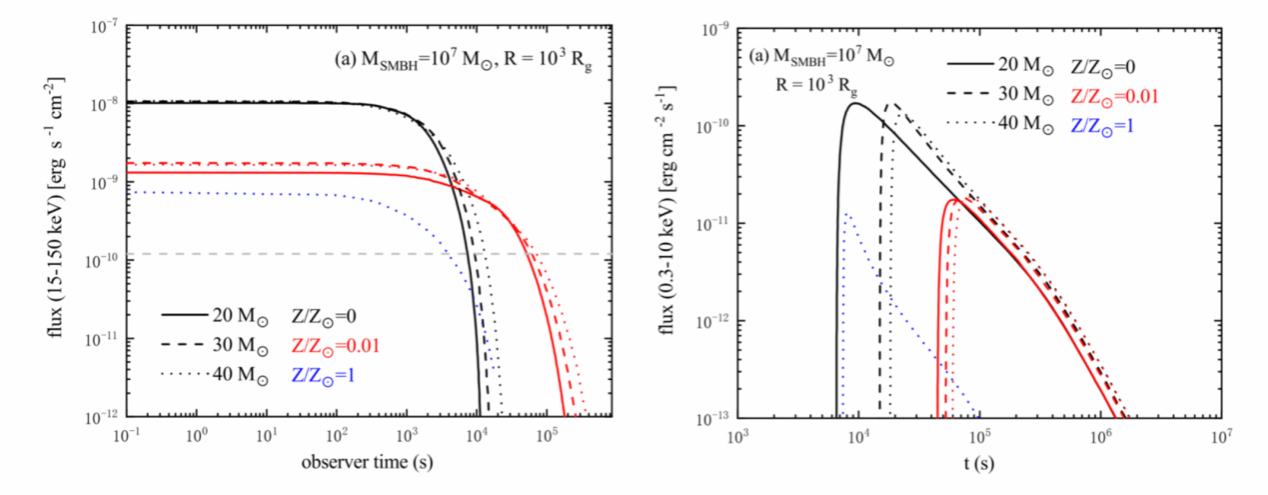 我们研究了前身星质量和金属丰度对伽马暴喷流在AGN盘内传播的影响。图1 展示了喷流在盘内传播的情况。对于那些可以成功突破的喷流,我们进一步计算了相应的瞬时辐射和余辉辐射,同时还考虑了AGN中心超大黑洞质量和爆发所处位置对辐射信号的影响。图2展示了突破的喷流产生的瞬时辐射和余辉。我们的结果表明,对于红移1以内的AGN,这些成功突破的喷流所产生的信号有可能被Swift卫星和天关卫星所探测。未来成功的探测将帮助人们限制AGN吸积盘和盘内恒星的结构和演化历史。