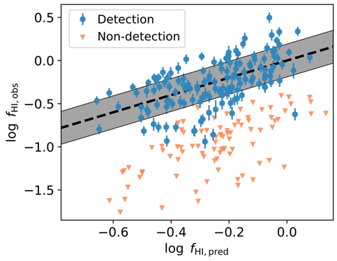 图:孤立星系中观测的中性氢含量和标度关系预测的中性氢含量对比。虚线为一比一关系,蓝色是探测点,橙色为上限点。
