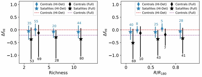 图:中性氢含量差异随星系群成员数(左)及星系到中心星系投影距离(右)的变化关系。右图中,卫星星系直接计算距离中心星系的投影距离,中心星系的距离则取的是最近的一个卫星星系的投影距离。