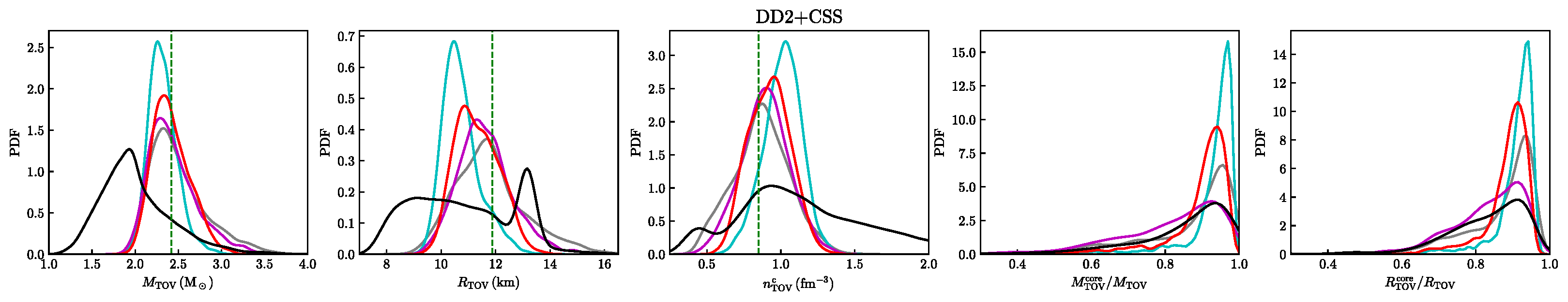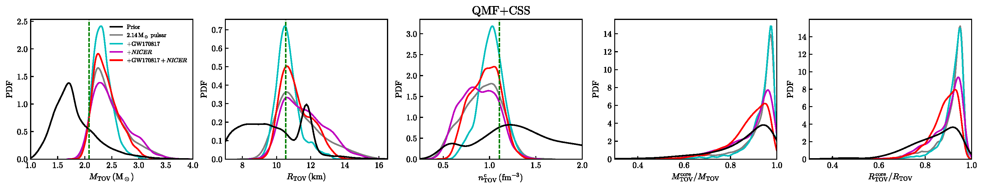 图.四种不同的分析下,混杂星的最大质量及各种性质的后验概率密度函数(90%置信度):M_TOV为最大质量,R_TOV为最大质量星体的半径,n_TOV为核心密度,最右4图分别为夸克核所占整个星体的质量和半径比。自左六图的绿色竖线表示无夸克核中子星的相应结果。先验条件均用黑线标出。上:QMF;下:DD2。