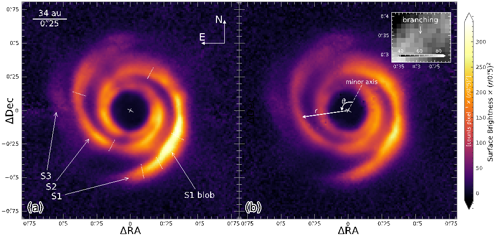 厦门大学方陶陶教授课题组和美国加州理工学院任彬博士及加拿大维多利亚大学董若冰教授等展开合作,分析了位于智利的欧洲南方天文台甚大望远镜 (VLT)上的SPHERE仪器对SAO 206462星盘的多时段观测数据。通过计算旋臂整体运动的模式,并与现有的两种理论的预测进行对比,我们发现SAO 206462系统的两条旋臂运动速度有一定的差异。该差异表明这两个旋臂可由两个不同的行星带动。该结果是国际上首个发现的两条旋臂可能存在运动差异的系统。此外,该发现利用了相隔仅一年的观测数据,从而显著降低了之前的约五年观测时间要求。
