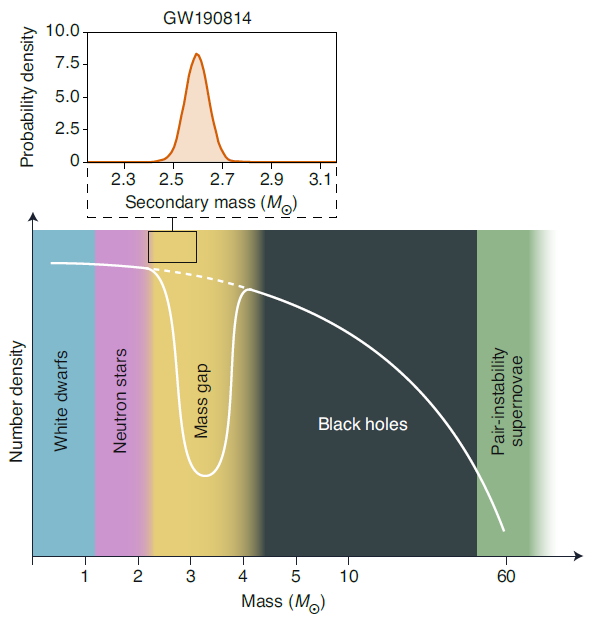 致密天体质量间隙(mass gap)难题是近期天体物理领域最热门的课题之一,分为低、高(或第一、第二)质量间隙,如图1所示。低质量间隙指,约2-5M⊙致密天体的缺失(亦有其他质量范围的提法,比如2.3-5M⊙或2.5-5M⊙,源于中子星质量上限的不确定性)。最初恒星演化理论上并没有所谓低质量间隙的预言,但早期X射线双星观测从未发现2-5M⊙的致密天体;近十年以来,人们利用Shapiro delay效应测定发现三颗质量在2M⊙左右的中子星—PSR J1614-2230, PSR J0348+0432和MSP J0740+6620,及其他电磁观测手段观测陆续发现一些处于2-5M⊙的中子星或黑洞候选体,引力波探测更是发现三个候选体,即双中子星并合事件GW170817和GW190425的并合产物,以及GW190814并合前的一颗致密星。也就是说,低质量间隙可能存在,但并非空无一物,其宽度和深度犹未可知。高质量间隙指,理论预言大质量前身星因为pair-instability效应会被完全炸掉而没有剩余,故不存在由单颗大质量恒星(约130-250M⊙)中心塌缩形成大于约45M⊙的黑洞。但引力波探测却发现很多在并合前大于45M⊙的黑洞。