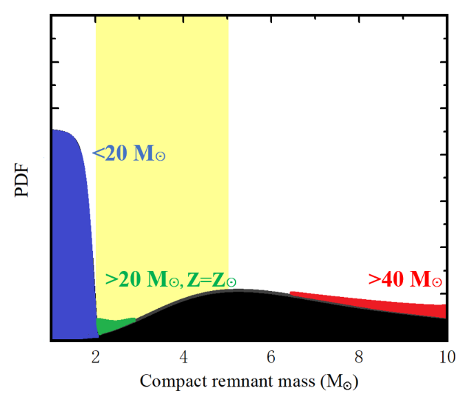 我们发现,如果20-40M⊙低金属丰度前身星占主导,其典型初始爆发能量约2B(其中1B=1051erg),剩余的可观测能量为0.02-0.83B,远低于现有观测超新星,则必然会出现存在一定深度和宽度的低质量间隙。如图2所示,如果认为所有前身星初始爆发能量呈高斯分布,典型值为2B,那么小于20M⊙的前身星(蓝色区域)产生大量中子星;约20-40 M⊙低金属丰度前身星(黑色区域)通过回落吸积,中心致密天体质量多数增长到5M⊙以上;20-40M⊙太阳金属丰度前身星(绿色区域)质量增长很小,仍停留在质量间隙(黄色区域)内;大于40M⊙前身星则主要贡献高于质量间隙的黑洞质量分布。这一结果与现有观测吻合;同时,暗示我们必须积累足够多的致密天体质量样本,才能确定质量间隙的形状,以此可以进一步限制前身星在宇宙中的分布、爆发机制和各种属性。