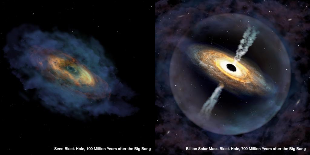 此前有学者提出,要在宇宙早期长成这样大质量的黑洞,需要以10万个太阳质量的黑洞作为种子,这类种子黑洞可以由气体云块的直接塌缩形成,虽然形成条件比较苛刻。也有学者认为,第一代恒星死亡的产物 —— 恒星级黑洞(约100个太阳质量)作种子足够了,只需要引入一段时间的超爱丁顿吸积(对于1亿个太阳质量的黑洞,爱丁顿吸积意味着每年吸积约2.2个太阳质量)。