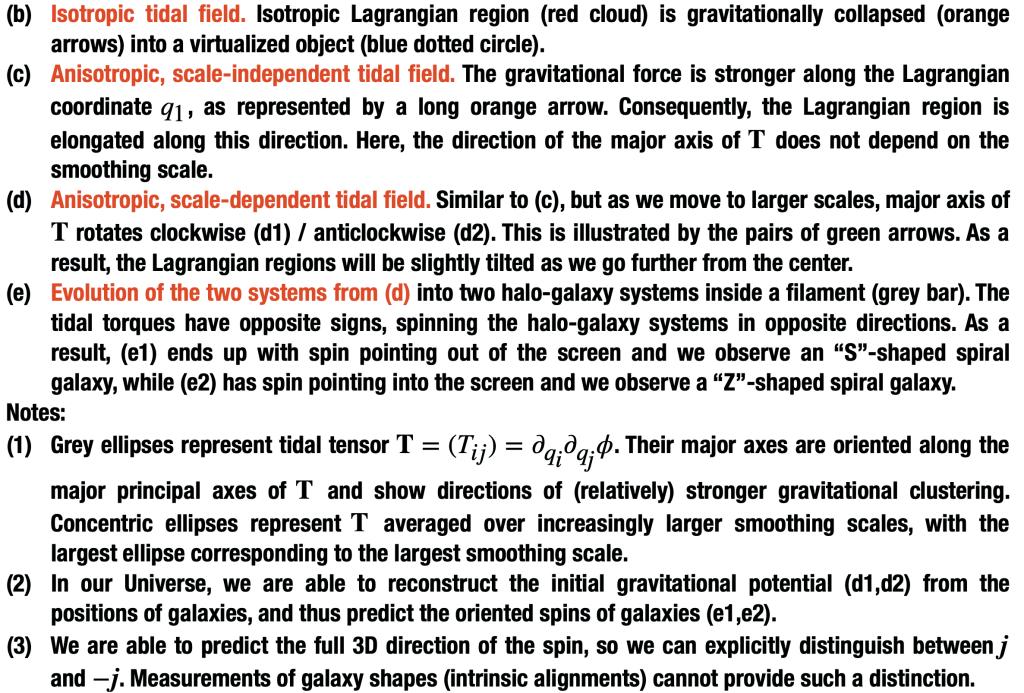 重构早期宇宙的信息 —— 为了回答早期宇宙结构的问题,我们需要观测那些与原初宇宙结构的信息线性相关的观测量。太小尺度的恒星、行星甚至世间万物,都经历了高度非线性的过程,与宇宙早期的结构相关性很低;宇宙微波背景辐射、星系分布和大尺度结构仍然包含宇宙早期结构的信息。星系的旋转方向和其所在的暗物质晕(dark matter halo)的角动量方向高度相关,而暗物质晕在Euler空间和Lagrangian空间(即宇宙初期的protohalo)也呈现角动量方向的高度相关,而后者可以很好地被宇宙早期的潮汐扭动理论(tidal torque theory)描述。所以,在Lagrangian空间的星系角动量是早期宇宙结构的探针。