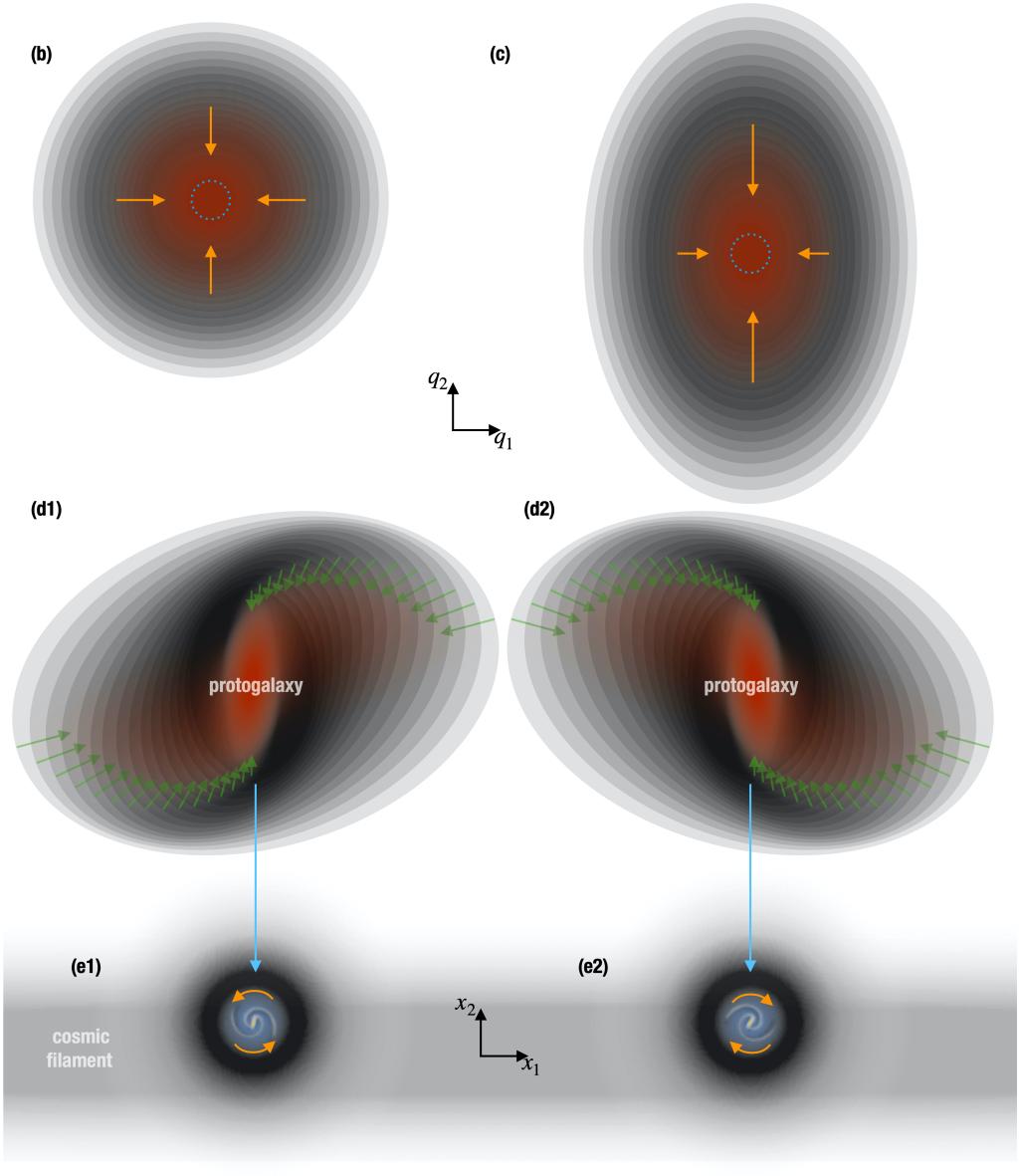 潮汐扭动(tidal twist)—— 星系分布可重构宇宙原初密度场。我们提出利用密度(潮汐)场信息重构原初角动量信息(spin mode reconstruction),并验证了其与星系/暗物质晕的可观测角动量的相关性。潮汐场,即密度场的逆Laplace算子的Hessian矩阵。图(b-e)中展示了二维空间的宇宙中潮汐与星系角动量的联系,其中我们用椭圆的长轴和短轴表示潮汐张量的两个本征轴,椭圆的大小对应于相应(平滑)尺度的潮汐。(b)中各向同性且不依赖于尺度的潮汐场导致球(圆)塌缩,不产生角动量;(c)中各向不同性、但尺度无关的潮汐导致椭圆塌缩,不产生角动量;(d)中不同尺度潮汐场的本征轴(绿色箭头表示潮汐主轴)随尺度变化,大尺度的潮汐场扭动小尺度的原星系(protogalaxy),产生角动量spin mode,并在(e)中的宇宙纤维结构(cosmic filament)中形成两个角动量相反的星系。(d1,e1)和(d2,e2)互为镜面反演;这种奇宇称(parity-even)的可观测量可被原初偶宇称(parity-even)的密度场(标量)及潮汐场(对称张量)预测,因此这个可观测的角动量也是早期宇宙的探针。早期宇宙的宇称破缺可能会通过这种spin mode携带到今天星系的角动量场。Yu, Hao-Ran et al. 的Conclusion and discussion中及相关参考文献给出了可能的对称性破缺机制。